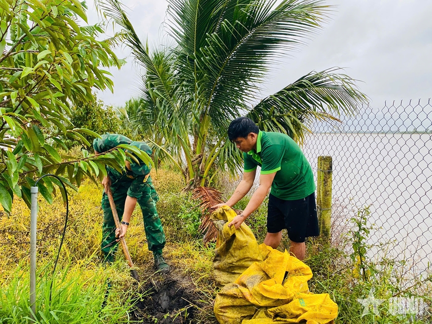 Cùng ngày, tại xã Vĩnh Gia, Đồn biên phòng Vĩnh Gia đã huy động 15 cán bộ, chiến sĩ kịp thời hỗ trợ hộ ông Hứa Văn Kiệt (ấp Vĩnh Hiệp) gia cố bờ bao, đắp đê chống ngập cho vườn cây ăn trái rộng khoảng 3.000 m². Ngay khi nhận được tin báo nước lũ dâng nhanh, lực lượng Biên phòng đã mang theo dụng cụ, bao cát, đất và vật liệu cần thiết phối hợp cùng gia đình đắp đê, bảo vệ an toàn toàn bộ diện tích vườn cây.
