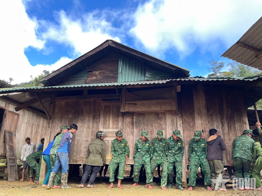 | Cán bộ, chiến sĩ Đồn Biên phòng Ga Ty phối hợp di dời nhà dân ra khỏi khu vực có nguy cơ bị sạt lở. |