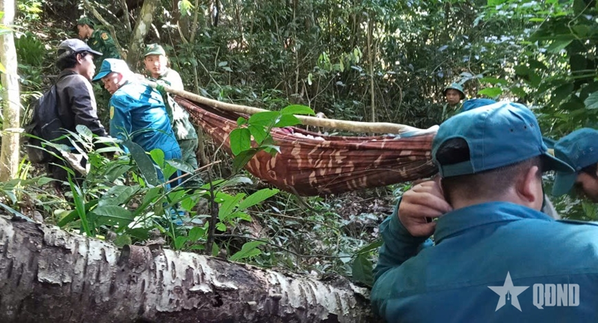 | Cán bộ, chiến sĩ Đồn Biên phòng La Êê phối hợp với lực lượng dân quân, bảo vệ rừng đưa chị Pơ Long Thị Diễm đi cấp cứu. |
