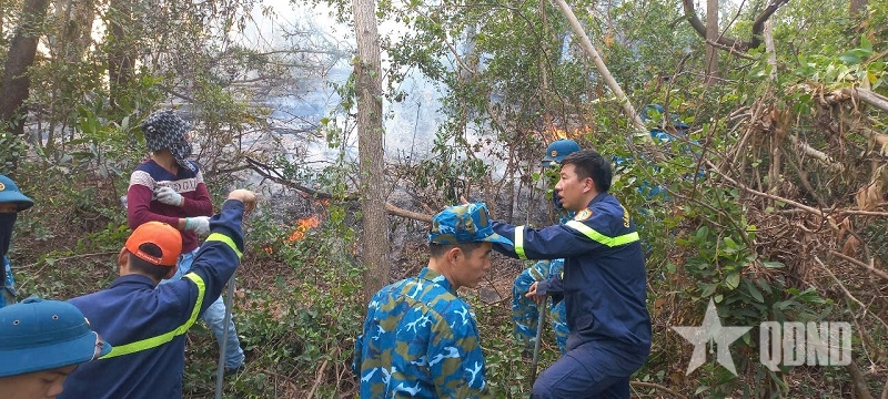 | Cán bộ, chiến sĩ Kho K1 và Trạm radar 22 cùng các lực lượng chức năng tham gia chữa cháy rừng. |