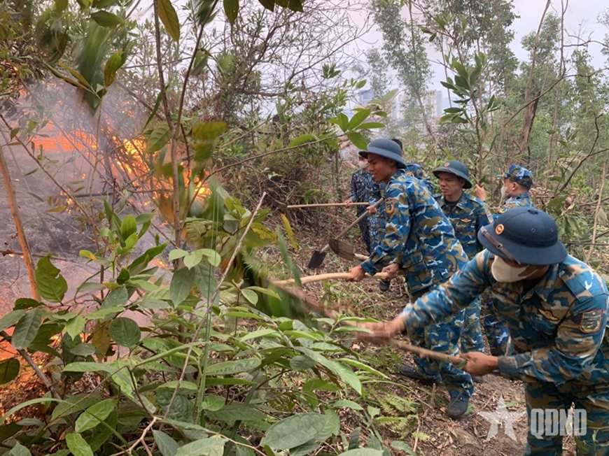 | Cán bộ, chiến sĩ Kho K1 và Trạm Radar 22 tham gia chữa cháy rừng. |