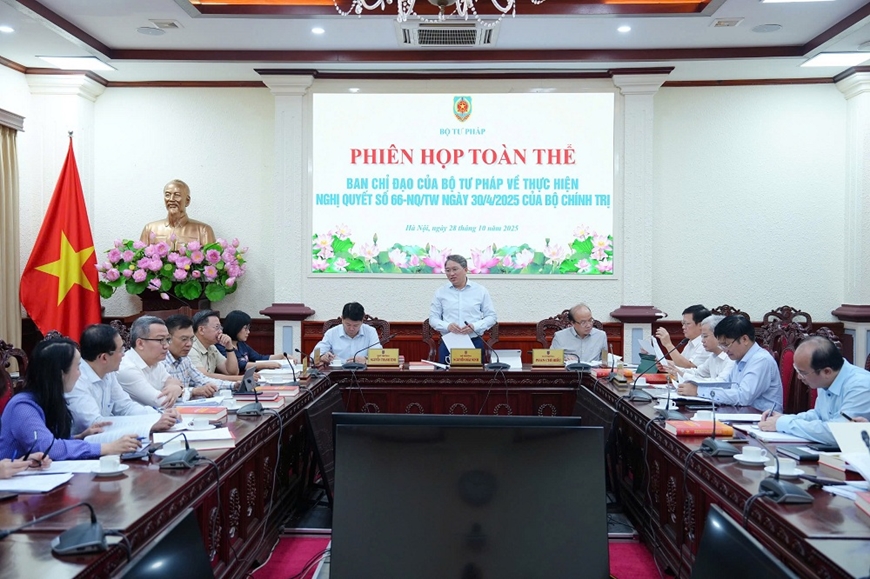 Tại báo cáo kết quả thực hiện Nghị quyết số 66-NQ/TW ngày 30-4-2025 của Bộ Chính trị về đổi mới công tác xây dựng và thi hành pháp luật đáp ứng yêu cầu phát triển đất nước trong kỷ nguyên mới và các Chương trình, Kế hoạch, Thông báo của Ban Chỉ đạo Trung ương về hoàn thiện thể chế, pháp luật tại Bộ Tư pháp từ tháng 5-2025 tới nay, qua rà soát Nghị quyết số 66-NQ/TW, Nghị quyết số 140/NQ-CP và các Chương trình, Kế hoạch, Thông báo của Ban Chỉ đạo, có 83 nhiệm vụ được giao, trong đó có 32 nhiệm vụ thường xuyên, 61 nhiệm vụ giao việc có thời hạn hoàn thành, 40 nhiệm vụ phải hoàn thành trong năm 2025; đã hoàn thành 31 nhiệm vụ, chiếm tỷ lệ 77,5% việc phải hoàn thành trong năm 2025.