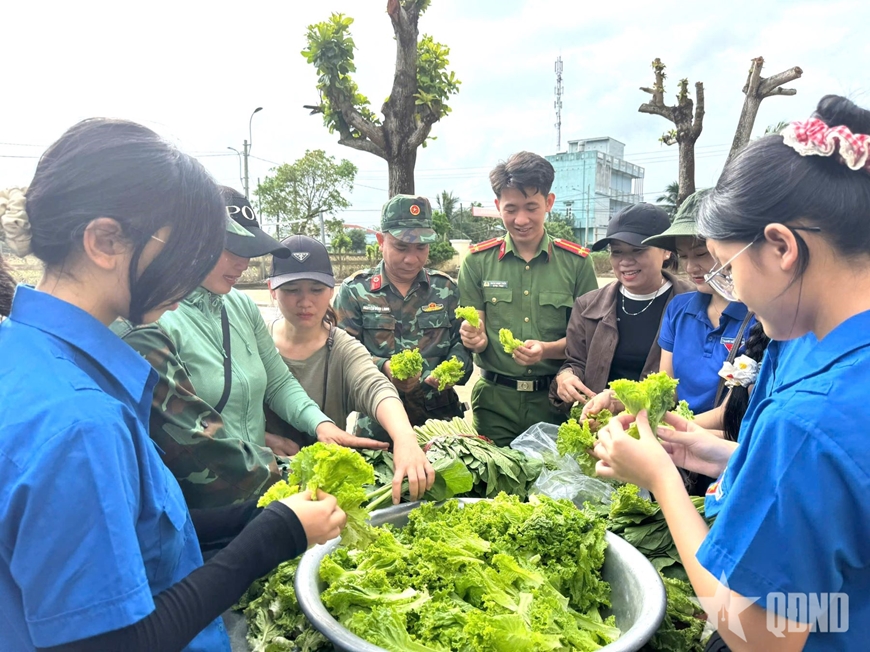Hội phụ nữ và Đoàn Thanh niên xã Đồng Xuân cùng cán bộ, chiến sĩ Sư đoàn 2 chuẩn bị rau xanh.