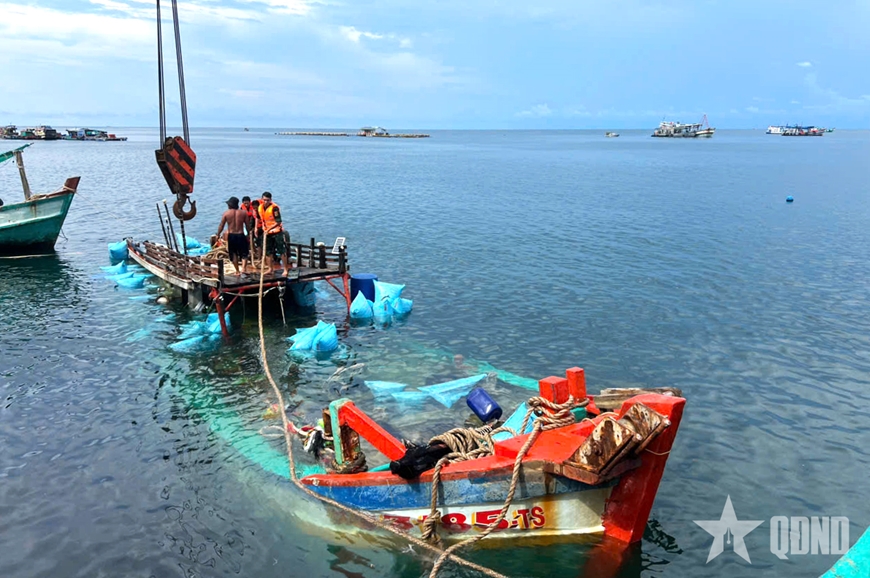 Hiện nay, Đồn Biên phòng Hòn Chuối tiếp tục phối hợp với ngư dân hỗ trợ khắc phục hậu quả, đồng thời lai dắt tàu vào bờ để sửa chữa.