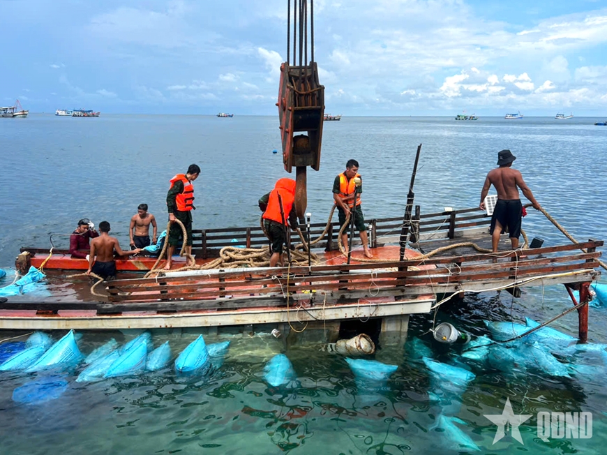 Đồn Biên phòng Hòn Chuối (Bộ đội Biên phòng tỉnh Cà Mau) phối hợp cùng ngư dân sử dụng cẩu 80 tấn trục vớt cá.