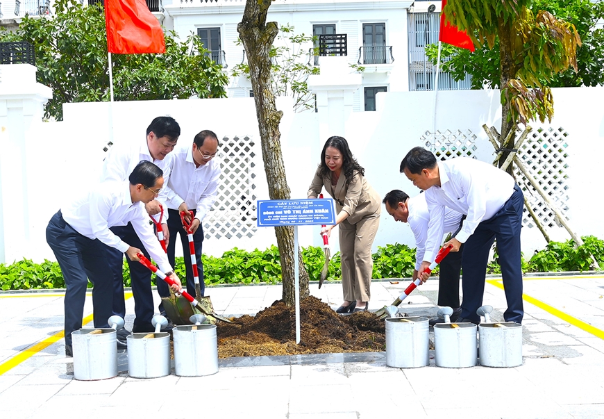| Phó chủ tịch nước Võ Thị Ánh Xuân cùng lãnh đạo tỉnh Cà Mau trồng cây lưu niệm. |