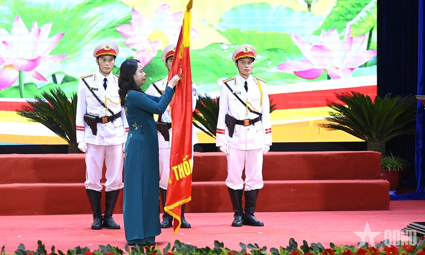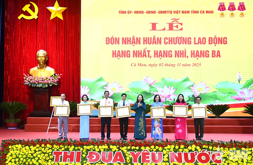 | Đồng chí Võ Thị Ánh Xuân trao Huân chương Lao động hạng Nhất tặng Đảng bộ, chính quyền và nhân dân tỉnh Cà Mau. |