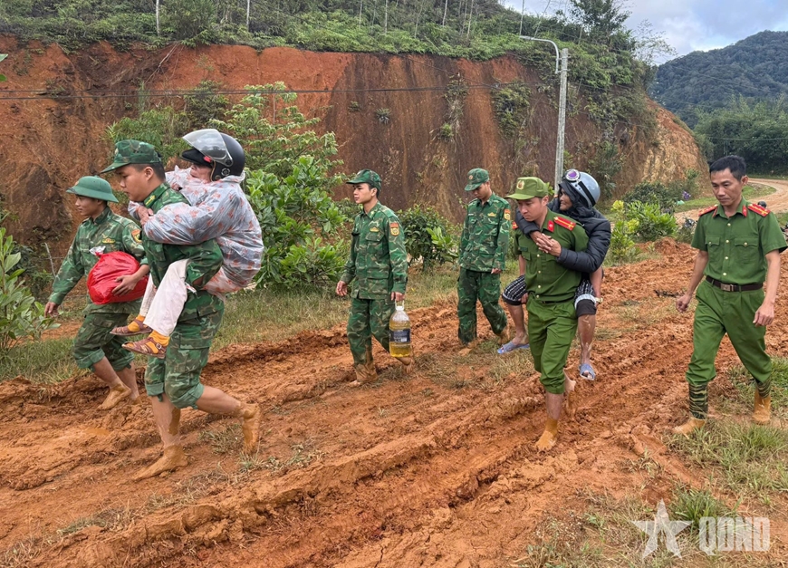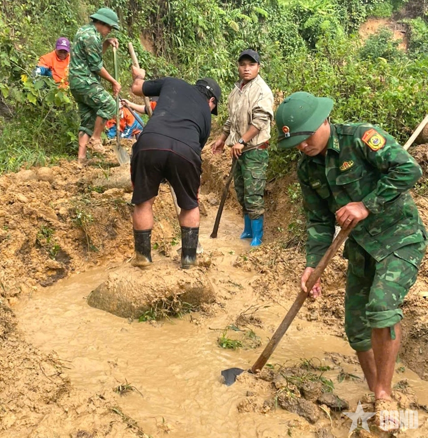 Cán bộ, chiến sĩ Đồn Biên phòng Ga Ry (Ban chỉ huy Bộ đội Biên phòng TP Đà Nẵng) phối hợp với các lực lượng khắc phục đường giao thông qua thôn A Roi, xã Hùng Sơn.