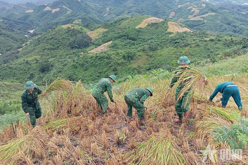 Cán bộ, chiến sĩ Đồn Biên phòng Đắc Pring (Ban chỉ huy Bộ đội Biên phòng TP Đà Nẵng) phối hợp với các lực lượng giúp nhân dân xã Đắc Pring gặt lúa rẫy sau mưa, lũ.