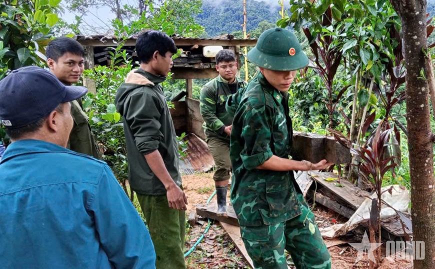 Cán bộ, chiến sĩ Đồn Biên phòng La Êê (Ban chỉ huy Bộ đội Biên phòng TP Đà Nẵng) phối hợp với các lực lượng tổ chức khắc phục hậu quả lũ lụt.