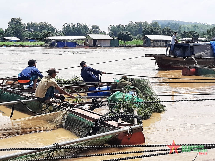 Các chiến sĩ dân quân huyện Định Quán giúp dân gia cố an toàn cho bè cá.