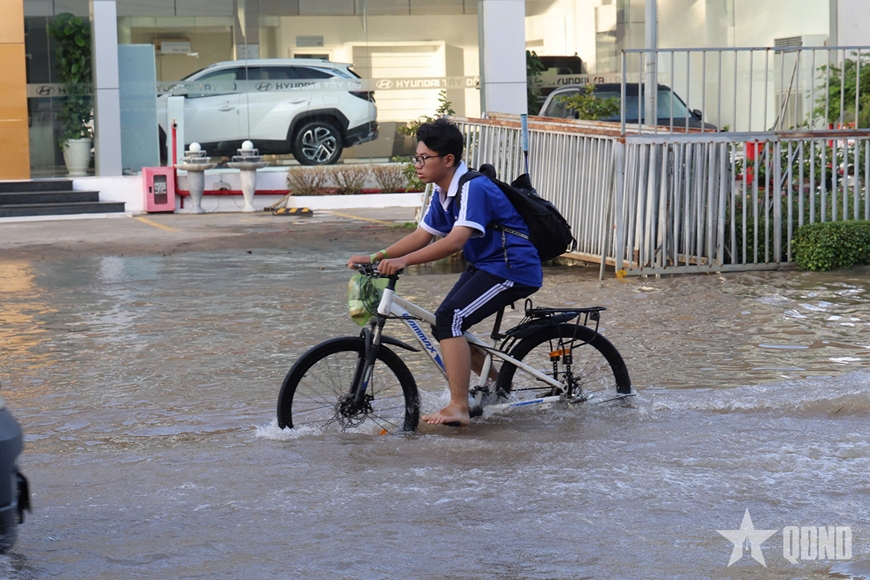 Học sinh đạp xe qua đoạn đường nước ngập để đến trường. |
