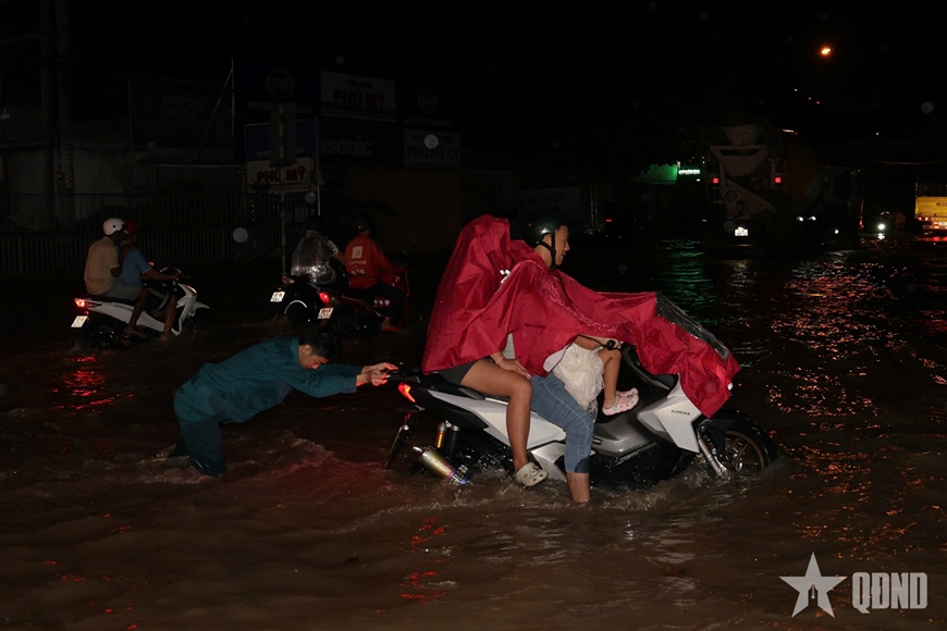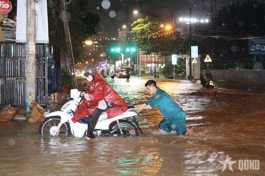 Lực lượng dân quân tích cực hỗ trợ người dân di chuyển qua đoạn đường ngập tối 8-10. |