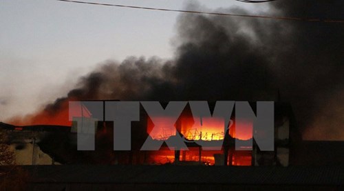 Lửa cháy dữ dội tại khu vực phía sau tòa nhà công ty Kwong Lung-Meko, ngày 23-3. (Ảnh: Thanh Liêm/TTXVN)