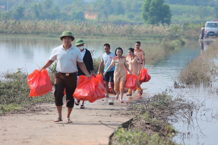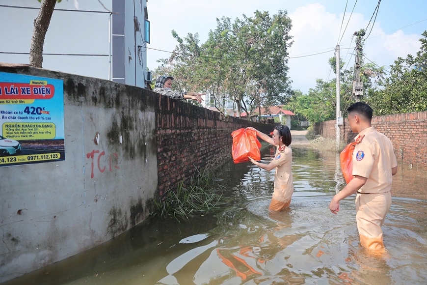 Từ ngày 8-10 đến nay, lực lượng CSGT phối hợp cùng Công an các xã, lực lượng Quân đội và chính quyền cơ sở đã tổ chức di dời an toàn hàng trăm hộ dân với hàng nghìn nhân khẩu tại các xã Trung Giã, Đa Phúc, Thư Lâm; đồng thời trang cấp áo phao, tiếp tế lương thực và các nhu yếu phẩm thiết yếu cho nhân dân, góp phần bảo đảm an toàn tính mạng và tài sản của người dân vùng ngập.