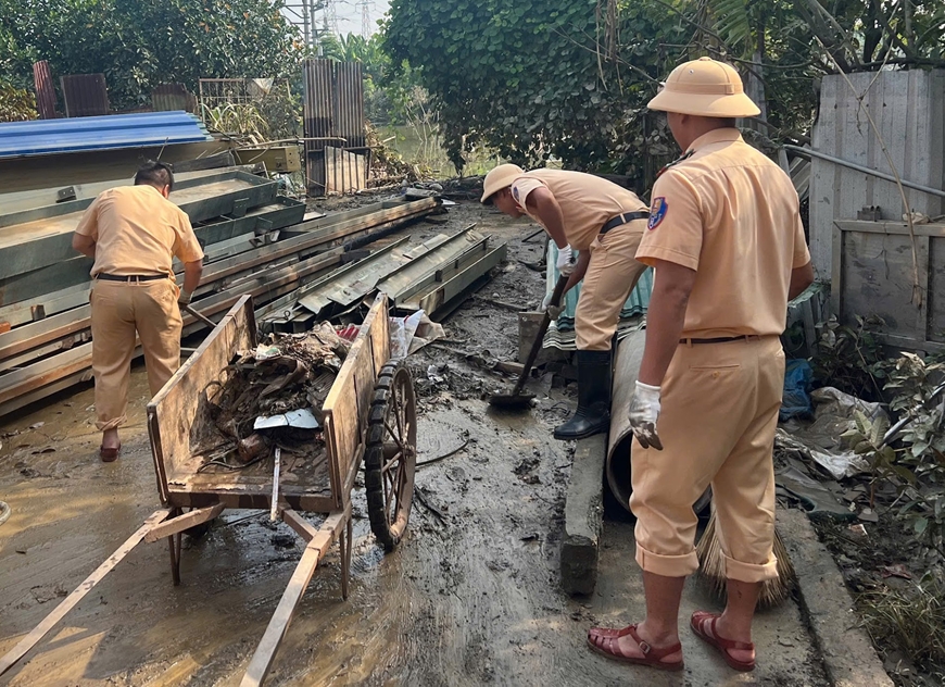 Ngay khi nước rút, Đoàn thanh niên và Hội Phụ nữ Phòng CSGT Công an TP Hà Nội tiếp tục huy động cán bộ, đoàn viên, hội viên phối hợp cùng chính quyền và nhân dân địa phương chung tay khắc phục hậu quả, thu dọn vệ sinh môi trường, hỗ trợ người dân nhanh chóng ổn định đời sống.