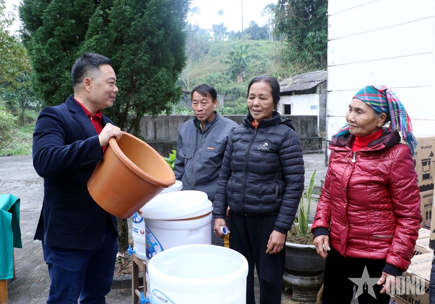 | Hướng dẫn người dân sử dụng bình lọc nước được cấp phát. |