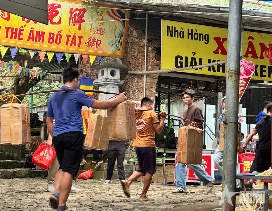 | Nếu leo bậc đá dốc khiến du khách "thở ra đằng tai", thì những người lao động địa phương vẫn băng băng gánh hàng vào tiếp phẩm. |