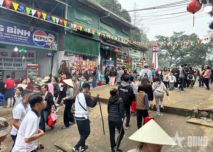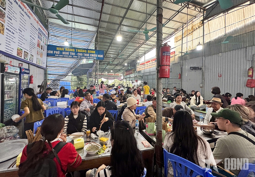 Lượng khách trẩy hội khá đông, khiến các nhà hàng, quán ăn cũng tấp nập phục vụ du khách. Giá các dịch vụ ăn uống cơ bản giữ ổn định. Với mức giá dao động từ 50.000 - 80.000 đồng, du khách có nhiều lựa chọn cho bữa trưa, từ phở gà, phở bò, bún, miến, cơm rang, cơm suất…