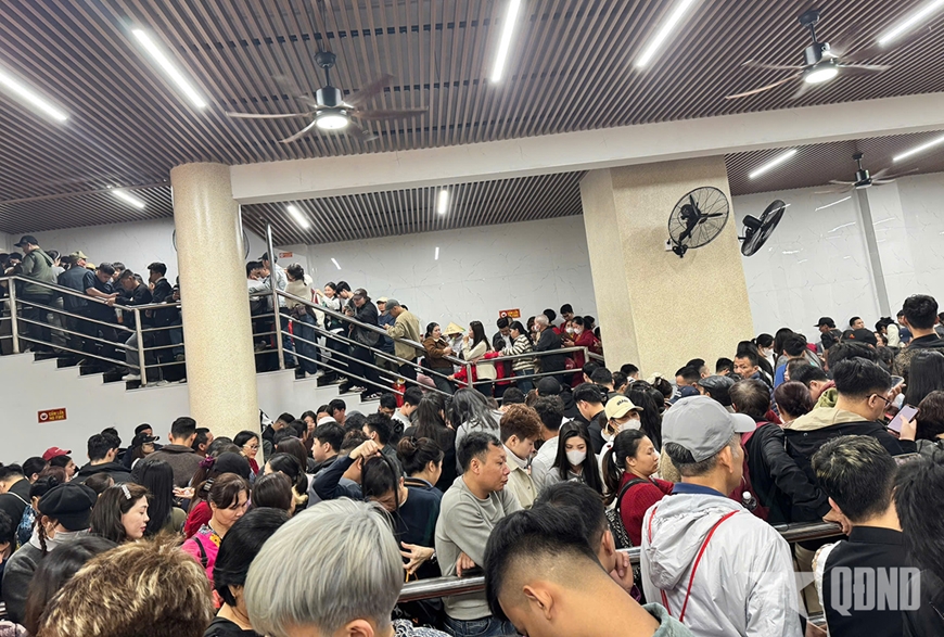 Khu vực cáp treo chùa Hương tắc nghẽn với hàng nghìn người xếp hàng nhích từng bước.