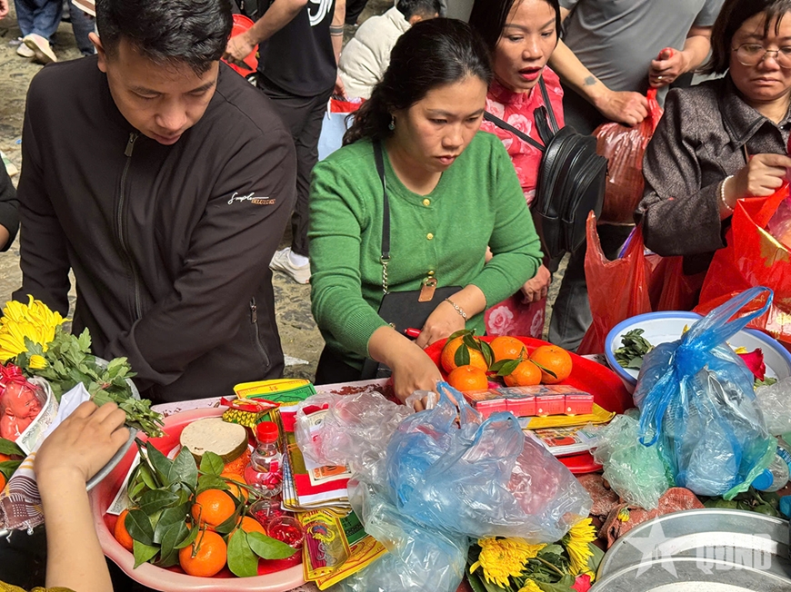 | Du khách sắp lễ dâng Phật tại động Hương Tích. |