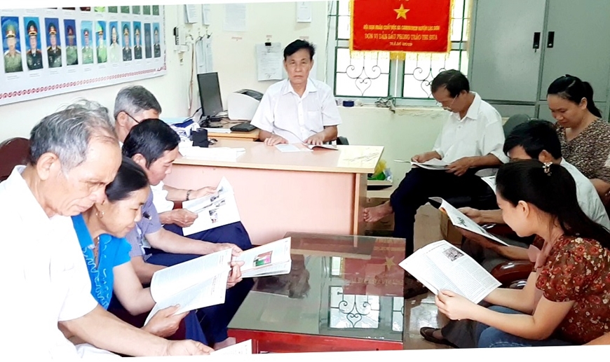 | Cán bộ, hội viên Hội Nạn nhân chất độc da cam/dioxin huyện Lạc Sơn, tỉnh Hòa Bình trong giờ đọc Tạp chí Da cam, tháng 3-2021. |