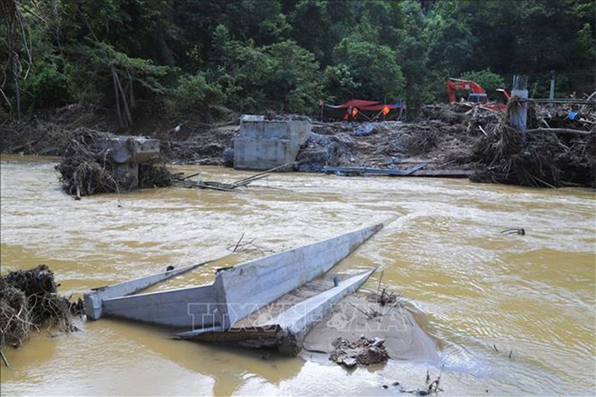 Mặt cầu Xốp Chạng (Nghệ An) bị nước lũ lật tung, cuốn trôi xuống lòng suối còn nằm tại hiện trường. Ảnh: TTXVN |
