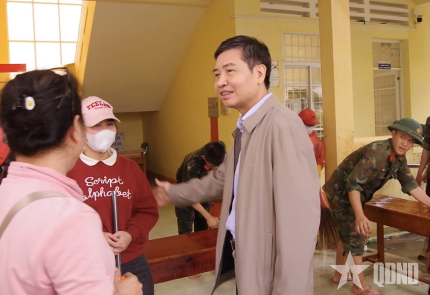 Tại Trường Tiểu học Hòa Mỹ Đông, xã Hòa Mỹ, Chủ tịch UBND tỉnh Đắk Lắk đã thăm hỏi, động viên giáo viên cùng cán bộ, chiến sĩ đang hỗ trợ dọn dẹp, mong muốn lực lượng tiếp tục nỗ lực để sớm đưa trường học trở lại hoạt động bình thường.
