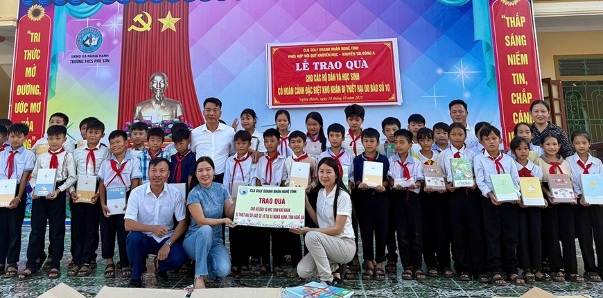 Đoàn trao quà tặng hộ dân, học sinh tại Nghĩa Hành, Nghệ An. |