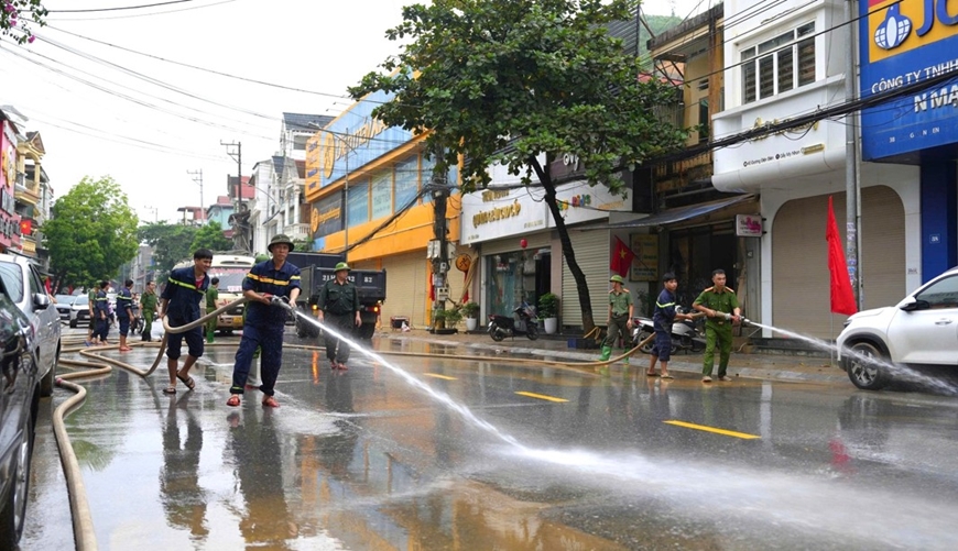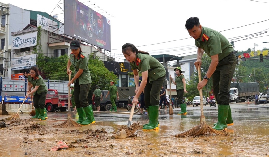 * Với phương châm “Nước rút tới đâu, dọn dẹp tới đó”, hôm nay (1-10), Công an tỉnh Lào Cai đã huy động hàng trăm cán bộ, chiến sĩ Công an các đơn vị và Công an các phường khẩn trương xuống các địa bàn nước rút, cùng với nhân dân tổ chức dọn dẹp nhà cửa, tiến hành nạo vét bùn đất tại các tuyến đường trên địa bàn thành phố bị ngập úng; vệ sinh, làm sạch môi trường.