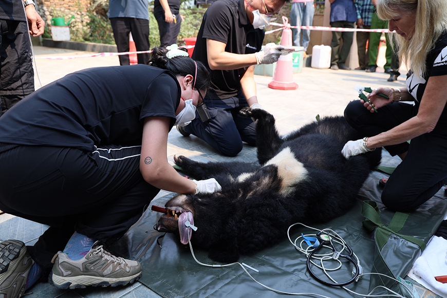 | Cán bộ, nhân viên Tổ chức Động vật châu Á kiểm tra sức khỏe của gấu sau khi gây mê. |