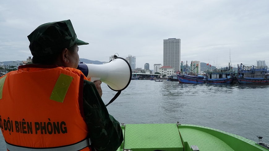 Bộ đội biên phòng Gia Lai thông báo diễn biến của bão số 12 cho ngư dân. Ảnh: TTXVN |