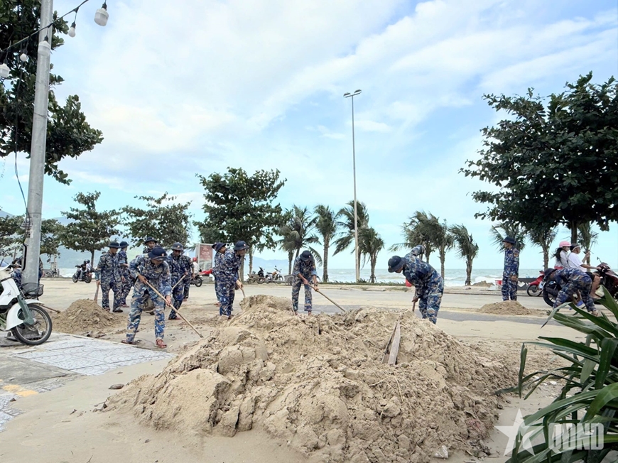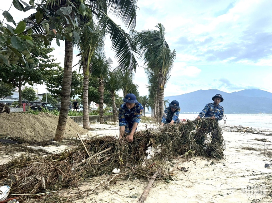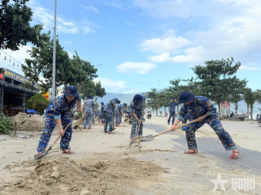 Sáng 7-11, hơn 300 cán bộ, chiến sĩ, dân quân thường trực Bộ CHQS TP Đà Nẵng, Ban chỉ huy Bộ đội Biên phòng TP Đà Nẵng, Sư đoàn Phòng không 375 (Quân chủng Phòng không - Không quân) phối hợp cùng địa phương, các đơn vị và người dân tiến hành dọn dẹp, thu gom rác thải dọc bờ biển sau bão số 13.