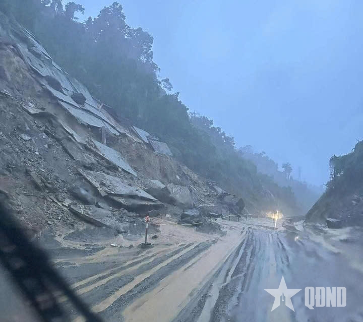 Trên Quốc lộ 14E, đoạn Km84+700 (xã Hiệp Đức), sạt lở đất nghiêm trọng khiến bùn đất, cây cối tràn xuống mặt đường gây tắc nghẽn hoàn toàn. Đáng chú ý, khu vực này từng sạt lở trong đợt mưa lớn cuối tháng 9, dù đã được gia cố mái taluy bằng bê tông xi măng nhưng tiếp tục bị sụt trượt do mưa kéo dài.