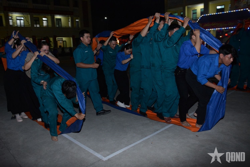 | Chiến sĩ "sao vuông" và đoàn viên thanh niên địa phương hào hứng tham gia các trò chơi tập thể. |