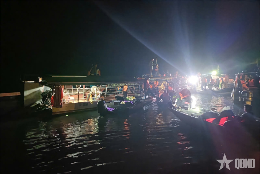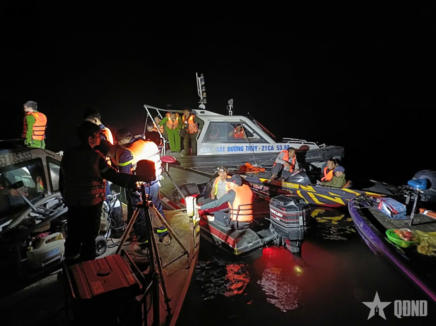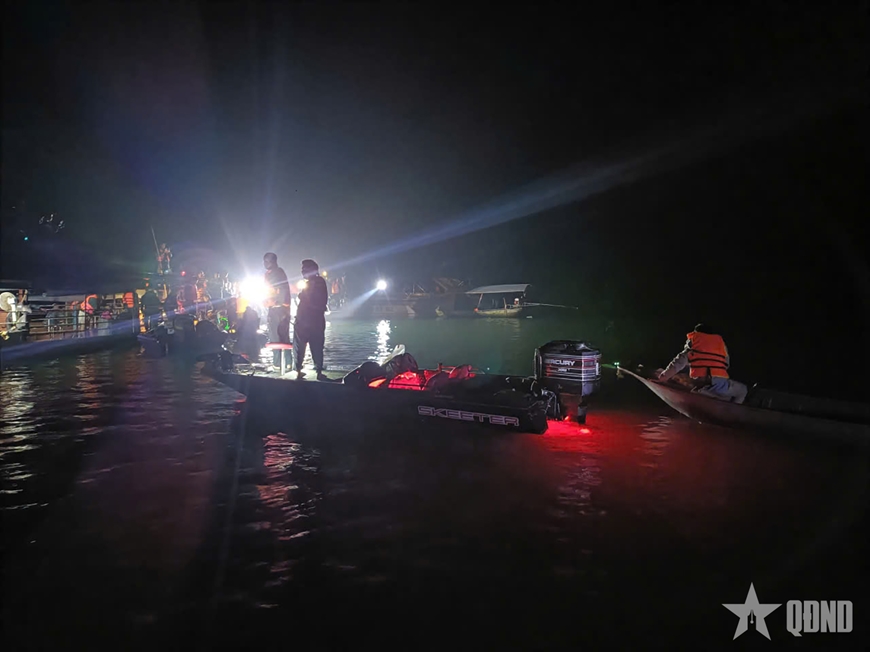 Các lực lượng cứu hộ xuyên đêm tìm kiếm nạn nhân mất tích trên hồ Thác Bà sau vụ tai nạn đặc biệt nghiêm trọng. Ảnh: THANH TIẾN