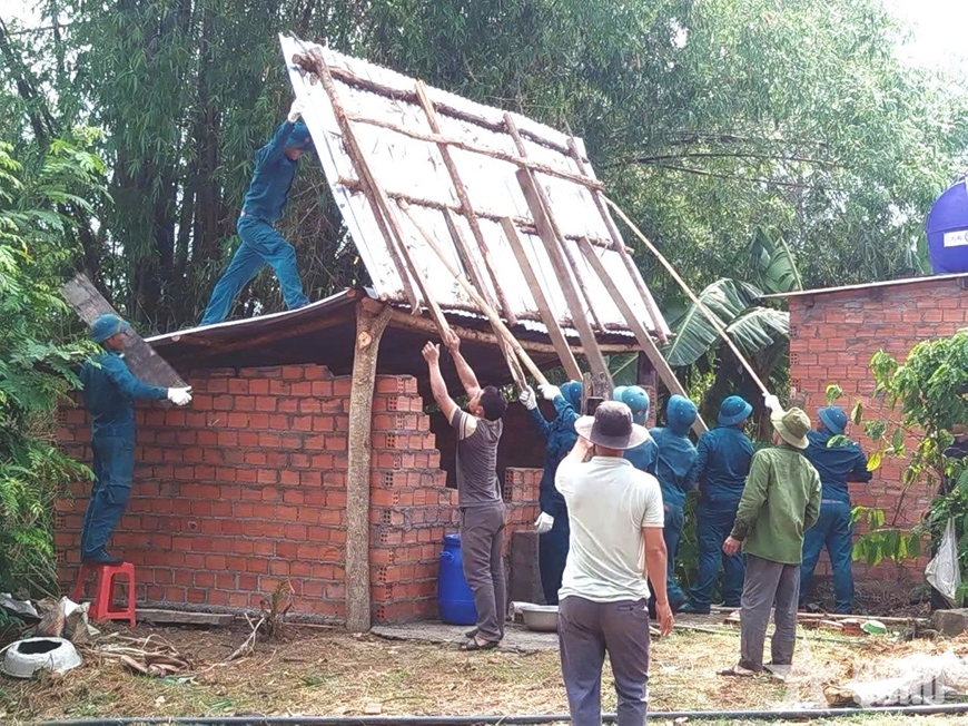 * Ngày 16-4, đơn vị tiếp tục điều động 14 cán bộ, chiến sĩ bộ đội, dân quân phối hợp cùng các lực lượng chức năng hỗ trợ người dân sửa chữa, gia cố lại những ngôi nhà bị tốc mái, từng bước ổn định đời sống.