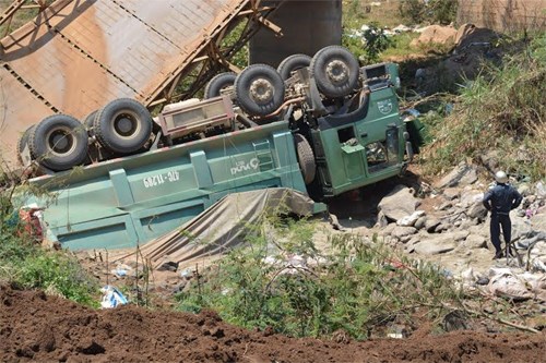Chiếc xe tải bị rơi xuống, lật ngửa.