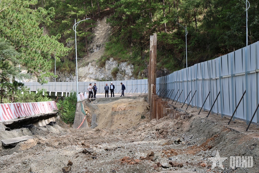Các đơn vị đã đóng cọc cừ, ván thép ở tim đường để gia cố nền đường ngăn sạt lở lan rộng. Bên cạnh đó, có giải pháp thoát nước mặt nước ngầm, gia cố kết cấu yếu tại các vị trí nứt lún cũng được triển khai.