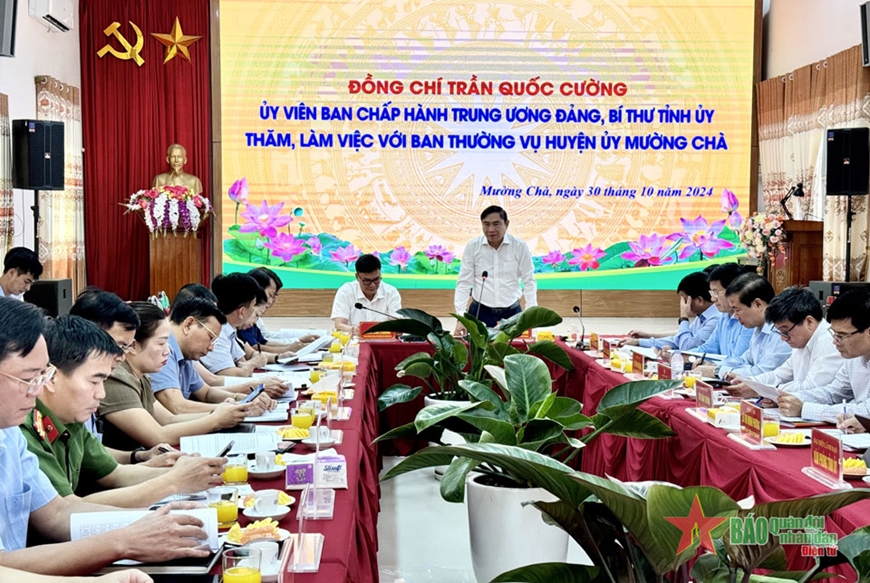 Buổi chiều 30-10, làm việc với Ban Thường vụ Huyện ủy Mường Chà về việc thực hiện nhiệm vụ chính trị từ đầu nhiệm kỳ 2020-2025 đến nay, Bí thư Tỉnh ủy Trần Quốc Cường yêu cầu huyện Mường Chà cần đánh giá thực chất, khách quan các vấn đề còn hạn chế đề ra giải pháp phù hợp, khả thi. Tập trung rà soát quy hoạch việc sử dụng đất, tăng cường quản lý Nhà nước về đất đai, tài nguyên, khoáng sản và bảo vệ môi trường. Đẩy nhanh tiến độ thực hiện các chương trình, dự án và giải ngân vốn đầu tư công; lãnh đạo thực hiện tốt nhiệm vụ quân sự, quốc phòng, đảm bảo an ninh chính trị, trật tự an toàn xã hội, bảo vệ an toàn tuyệt đối các mục tiêu trọng điểm, các hoạt động chính trị - kinh tế - văn hóa - xã hội và các Chương trình mục tiêu quốc gia. Tăng cường kiểm tra, giám sát đối với tổ chức đảng và đảng viên, nhằm chủ động phát hiện, ngăn chặn những khuyết điểm, vi phạm…