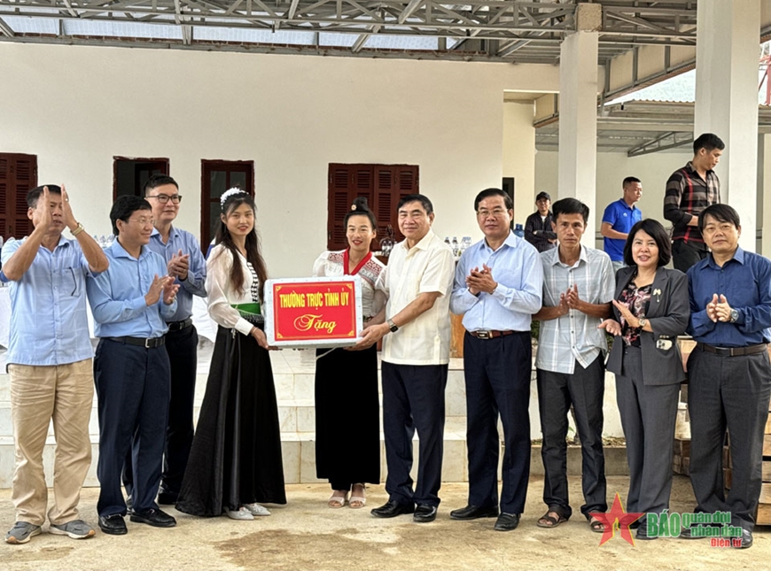 | Đồng chí Trần Quốc Cường cùng đoàn công tác trao quà tặng giáo viên, học sinh Trường PTDTNT THPT huyện Mường Chà. |