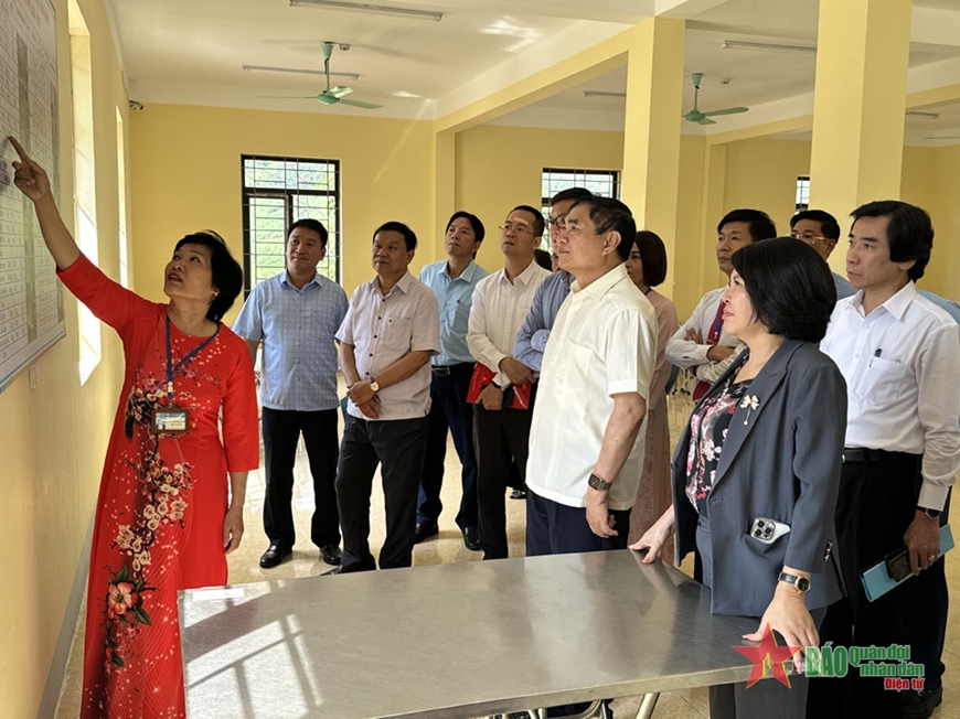 | Đồng chí Trần Quốc Cường (hàng đầu, thứ hai từ phải qua) cùng đoàn công tác, thăm, kiểm tra bếp ăn tập thể của Trường PTDTNT THPT huyện Mường Chà. |