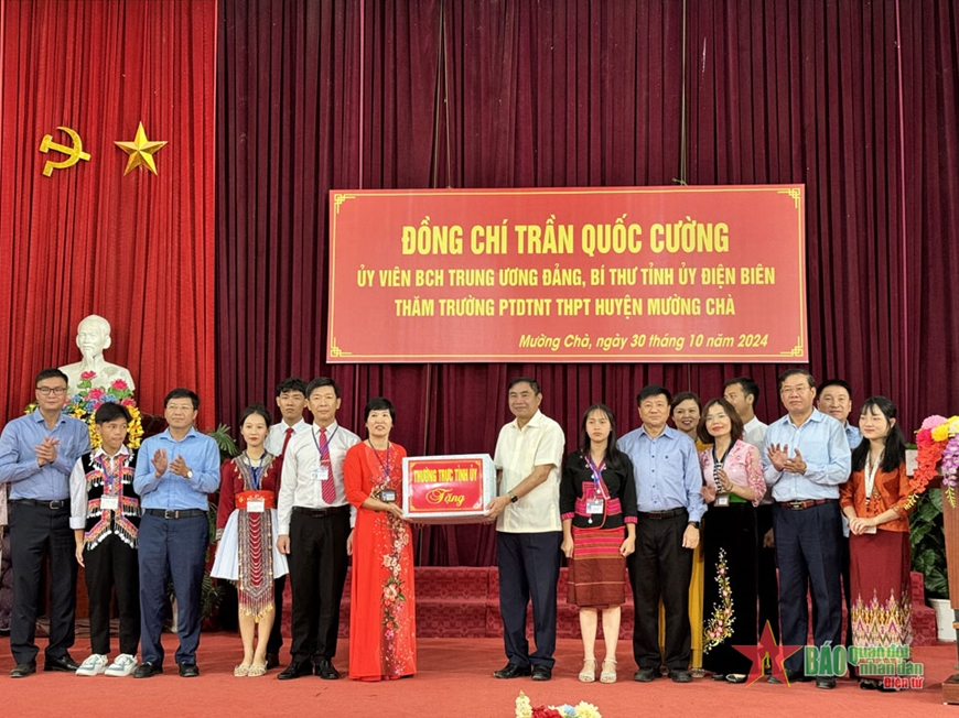 Tại Trường PTDTNT THPT huyện Mường Chà, Bí thư Tỉnh ủy Trần Quốc Cường ân cần thăm hỏi, động viên các thầy cô giáo và học sinh; biểu dương những kết quả của nhà trường đạt được trong thực hiện nhiệm vụ năm học 2023 - 2024. Bí thư Tỉnh ủy chúc mừng học sinh của Trường đạt thành tích cao tại các kỳ thi học sinh giỏi; kết quả kỳ thi tốt nghiệp THPT các năm qua đều đạt 100%. Đặc biệt là có trên 60% học sinh đỗ vào các trường đại học, cao đẳng…