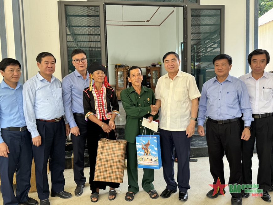 | Đồng chí Trần Quốc Cường (thứ ba từ phải qua) cùng đoàn công tác, thăm, tặng quà hộ nông dân sản xuất giỏi Quàng Văn Choi. |