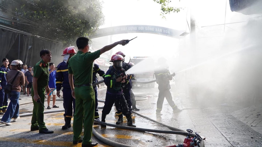Thời điểm xảy ra cháy, do ngôi nhà chứa hàng chục tấn hàng hóa dễ cháy gồm: Bánh kẹo, sữa, bìa, hộp caton nên đám cháy nhanh chóng bùng phát mạnh, khói đen dày đặc. Lực lượng PCCC đã bố trí nhiều mũi sử dụng hệ thống lăng giá, vòi phun nước áp lực cao phun trực tiếp khống chế đám cháy và làm mát những ngôi nhà xung quanh, ngăn chặn đám cháy lan rộng. Đồng thời cán bộ, chiến sĩ cảnh sát PCCC phối hợp cùng công an phường Điện Biên Phủ, nhân dân tổ dân phố khẩn trương di dời nhiều tài sản đến nơi an toàn.