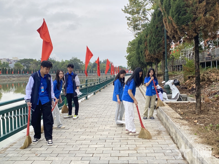 | Học sinh Trường Trung học phổ thông Lương Thế Vinh, tỉnh Điện Biên vệ sinh môi trường tuyến đường ven sông Nậm Rốm chuẩn bị phục vụ Lễ hội Hoa Ban năm 2026. |