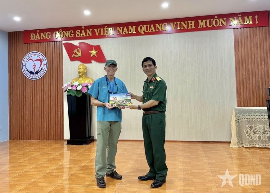 Thiếu tướng Hoàng Kim Phụng trao quà lưu niệm tặng bác sĩ Atwell Eddy Allan. Ảnh: ĐỨC ANH |