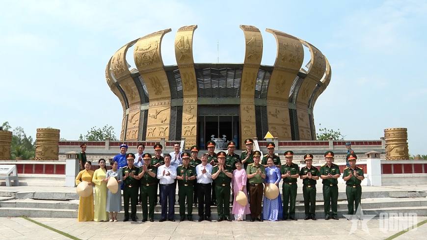 Đại tướng Nguyễn Trọng Nghĩa cùng đoàn công tác Quân ủy Trung ương, Bộ Quốc phòng, đại diện Bộ tư lệnh Quân khu 9, lãnh đạo TP Cần Thơ chụp ảnh lưu niệm cùng Ban quản lý Đền thờ Vua Hùng.