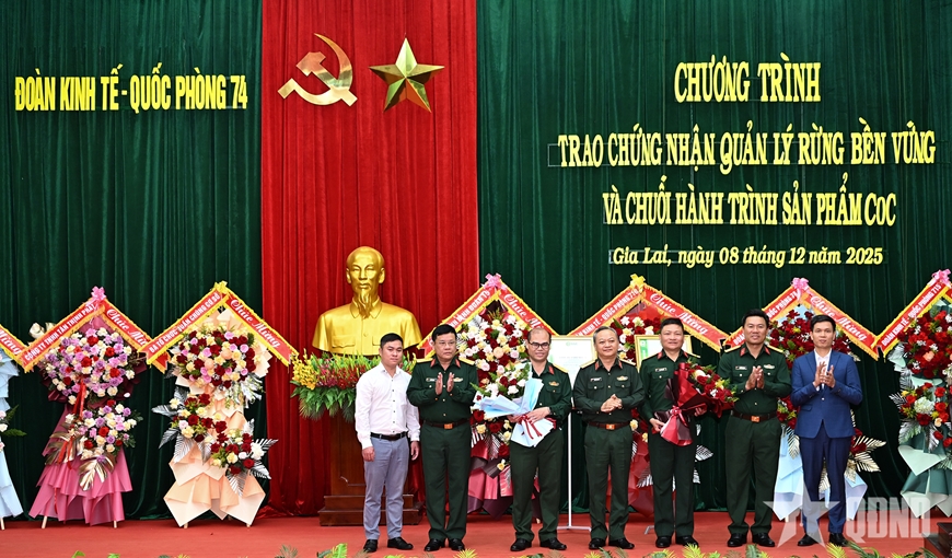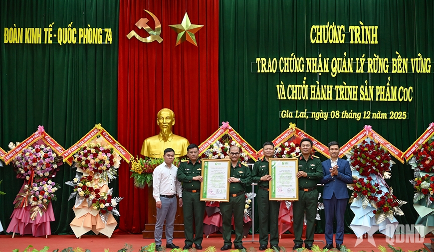 | Lãnh đạo Đoàn Kinh tế - Quốc phòng 74 nhận chứng nhận quản lý rừng bền vững và chuỗi hành trình sản phẩm CoC. |