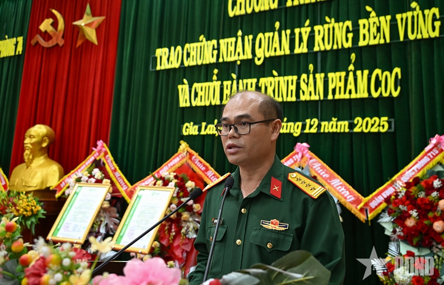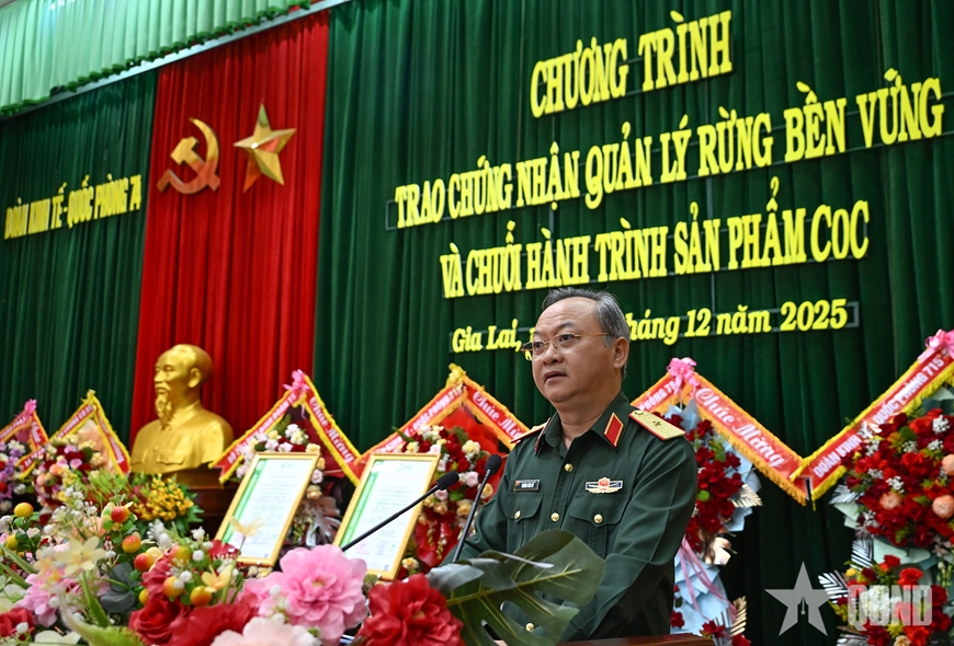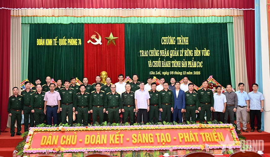 Phát biểu tại chương trình, Thiếu tướng Hoàng Văn Sỹ, Tư lệnh Binh đoàn 15 nhấn mạnh: Việc đạt được chứng nhận quản lý rừng cao su bền vững và chuỗi hành trình sản phẩm có ý nghĩa chiến lược, thể hiện bước tiến quan trọng của Đoàn Kinh tế - Quốc phòng 74 trong xu hướng phát triển bền vững, minh bạch và hội nhập quốc tế.